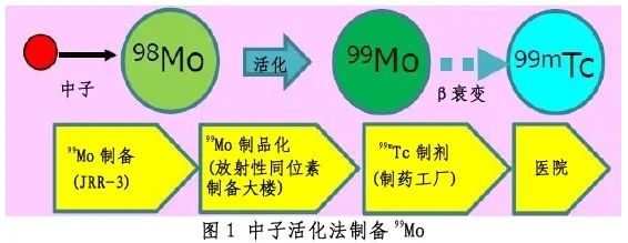 在國外,Mo-99是從高濃縮鈾的裂變產物中分離提取出來的,但JAEA正在推進研發利用JRR-3用中子輻照天然Mo-98靶材制備Mo-99的技術。從制備到應用于醫療診斷約3~4日。圖1為中子活化法制備Mo-99示意圖。