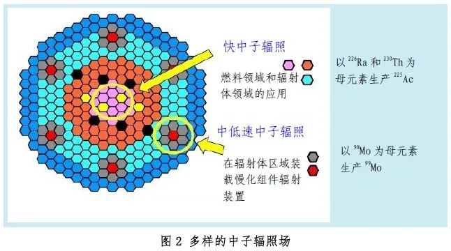 對于日本來說,僅確保研究所需的Ac-225是不夠的,從順利實施臨床試驗和確保未來所需用量的角度來看,除了利用加速器生產制備,日方還期望利用常陽堆進行大量生產。日本政府在2021年6月更新的“面向2050年碳中和綠色增長戰略”中也指出,常陽堆可以大量生產世界上稀有的醫用放射性同位素。通過推動常陽堆的重啟,有望為先進癌癥治療做出貢獻。圖2是常陽堆多樣的中子輻照場。