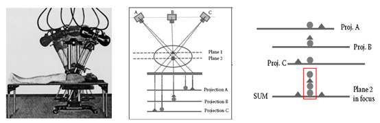 可以通過下圖了解傳統層析成像的原理。通過采集不同角度的投影數據(那時還只有膠片),將膠片簡單疊加在一起,其中一層的數據會被增強(這一層稱為焦平面)。下圖中Plane 2的數據(以圓形代表其細節)就被增強了。傳統層析成像,每次只能增強一個焦平面內的結構,而其它層的圖像仍然是模糊的。