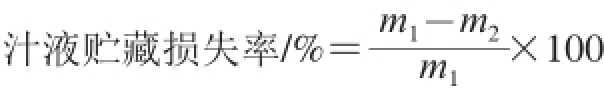 參考Davis等 [6]的方法稍作修改。充氮包裝前測定的樣品質量,去除包裝材料,將樣品表面的水分擦干后稱量其質量。汁液貯藏損失率按以下公式計算: