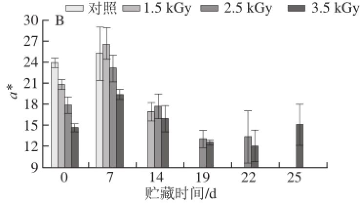 圖3 不同輻照劑量條件下冷鮮牛肉L*值(A)和a*值(B)隨貯藏時間的變化