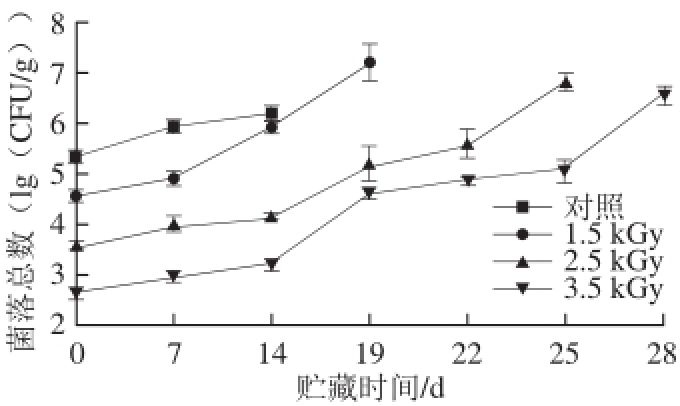 從圖1可以看出,在28 d的貯藏期間輻照組相比于對照組菌落總數顯著性(P<0.05)降低,且輻照劑量越大,菌落總數越低。在貯藏第0天(輻照后第1天)時,與對照組相比,處理組的菌落總數分別下降了0.766、1.801、2.673(lg(CFU/g)),差異顯著(P<0.05)。隨著貯藏時間的延長,冷鮮肉的微生物總數增加,對照組在冷藏第14天時菌落總數達到6.207(lg(CFU/g)),超過國家標準(10 6CFU/g),未經包裝處理的冷鮮肉的貨架期在5~7 d左右,充氮包裝在一定程度上也抑制了微生物的生長;1.5、2.5、3.5 kGy輻照處理組的菌落總數在分別第19、25、28天達到7.202、6.825、6.570(lg(CFU/g)),超出國家標準(10 6CFU/g)。