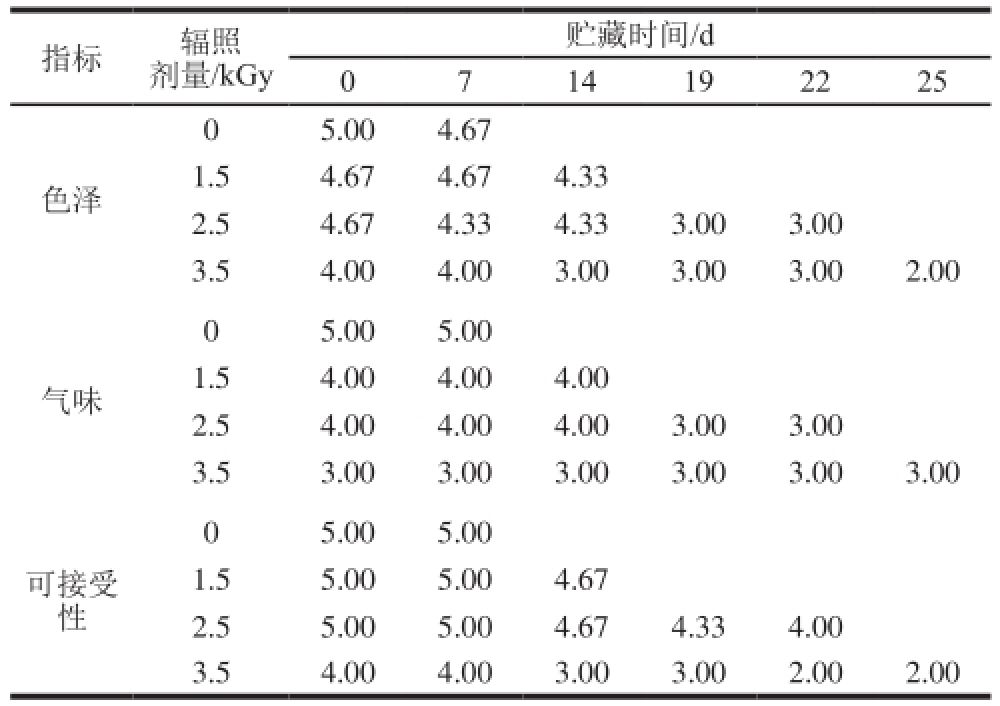感官形態是評判冷鮮肉新鮮程度最直觀的方式,同時也是影響消費者購買欲的重要方面。如表2所示,對照組和處理組在色澤及氣味方面存在差異。經過輻照處理冷鮮肉的顏色變深,亮度下降,色澤得分降低,且隨著輻照劑量的增加顏色更暗,得分更低;冷鮮肉經過輻照處理以后會產生一種特殊的“輻照味”,研究人員將這種“輻照味”描述為烤玉米味、燒焦味等 [15-17],同時眾多研究學者對于“輻照味”機理做了大量的研究,多數研究學者認為是冷鮮肉蛋白經過輻照發生分解產生的小分子醛酮物質引起,氧氣的存在是產生輻照異味的主要因素[18](多種解決辦法:絕氧環境下輻照、充入惰性氣體N2或CO2等氣凋包裝、降低輻照時肉的溫度至零度以下),由表2可知,1.5 kGy和2.5 kGy處理組之間的差異不明顯,而3.5 kGy處理組的氣味得分更低,因此輻照劑量大到超出某個范圍后,其輻照異味會加劇;在貯藏初期1.5、2.5 kGy處理組和對照組的可接受性得分較高,而3.5 kGy處理組感官接受性較差。隨著貯藏時間的延長,處理組和對照組3 項指標得分均呈現下降趨勢。因此從感官評價來看,1.5 kGy和2.5 kGy輻照處理可能更容易被消費者所接受。