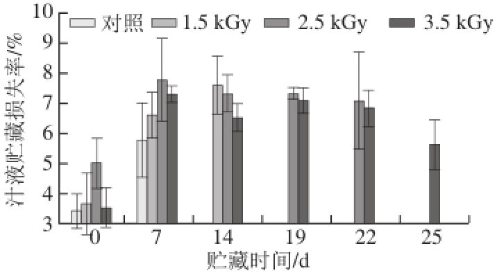 圖2 不同輻照劑量條件下冷鮮牛肉貯藏期間汁液流失的變化