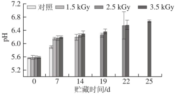 理論上認為:新鮮肉pH 5.8~6.2,次鮮肉pH 6.3~6.6,變質肉pH 6.7以上 [10]。由圖5可見,在貯藏第0天,對照組和處理組的pH值分別為5.56、5.59、5.58、5.60,差異不明顯,說明電子束輻照處理對冷鮮肉的pH值沒有顯著性影響;隨著貯藏時間的延長,在貯藏第7天時,對照組pH值為5.9,3 個處理組的pH值有所增加變為6.15、6.17和6.2,但是經過SPSS 19.0分析可知處理組和對照組之間無顯著性差異,此時處理組和對照組狀態良好,屬于一級冷鮮肉;隨著貯藏時間的延長,在微生物和內源酶的作用下,肉中的蛋白質被分解,使含氮物質增加,pH值升高,3.5 kGy處理組在貯藏第25天pH 6.68,屬于次鮮肉范圍。輻照處理使冷鮮肉pH值升高,但升高幅度不明顯。