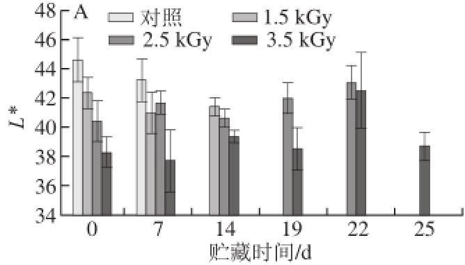 色澤是食品的一種基本物性,是評價冷鮮肉品質的重要指標,影響消費者的購買欲 [19]。L*和a*是評價冷鮮肉品質的兩個重要參數 [4]。由圖3A可以看出,在貯藏初期輻照組的亮度值L*低于對照組,原因可能是在貯藏初期輻照處理組肌紅蛋白氧化程度更大。隨著貯藏時間的延長,不同劑量的處理組之間存在差異,2.5 kGy處理組的顏色較鮮艷。肌紅蛋白(約占70%~80%)和血紅蛋白(約占20%~30%)是影響肉品顏色的兩大主要因素,肉的顏色主要取決于氧合肌紅蛋白、肌紅蛋白、高鐵肌紅蛋白之間的比例。還原型肌紅蛋白本身是暗紅色,與氧結合可生成鮮紅的氧合肌紅蛋白和褐色的高鐵肌紅蛋白。電子束輻照處理使冷鮮肉中自由基含量增加,肌紅蛋白被氧化成高鐵肌紅蛋白使冷鮮肉顏色紅度值a*降低(圖3B),與Kanatt等 [20]研究結果一致。