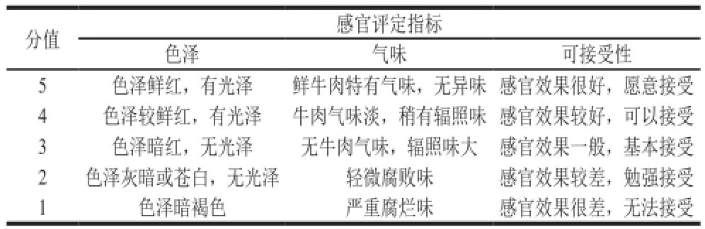 分值感官評定指標色澤氣味可接受性5色澤鮮紅,有光澤鮮牛肉特有氣味,無異味感官效果很好,愿意接受4色澤較鮮紅,有光澤牛肉氣味淡,稍有輻照味感官效果較好,可以接受3色澤暗紅,無光澤無牛肉氣味,輻照味大感官效果一般,基本接受2色澤灰暗或蒼白,無光澤輕微腐敗味感官效果較差,勉強接受1色澤暗褐色嚴重腐爛味感官效果很差,無法接受