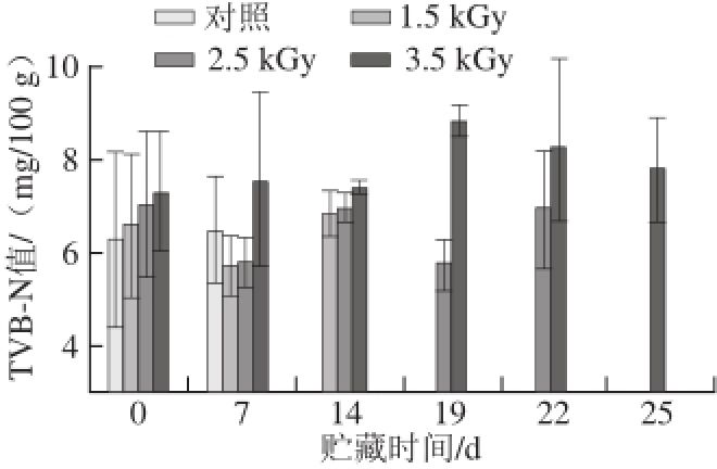 從圖7可以看出,隨著貯藏時間的延長,對照組TVB-N值增加,但未超過15.0 mg/100g,推測原因是充氮包裝抑制了微生物活動,蛋白質分解速度下降。輻照處理組在整個貯藏期間呈不規律性變化,在貯藏第0天,處理組的TVB-N值(6.63、7.07、7.30 mg/100g)均高于對照組(6.30 mg/100g),原因是輻照處理加速了蛋白質的氧化,使蛋白分解產生氨及胺類等堿性含氮物質增加,但在貯藏第7天,1.5 kGy和2.5 kGy處理組TVB-N值均低于對照組(6.50 mg/100g),3.5 kGy處理組(7.57 mg/100g)高于對照組。在貯藏期間輻照處理組TVB-N值均未超過國家規定的一級冷鮮肉15 mg/100g,該研究結果與Javanmard等 [25]一致,輻照可降低肉品中TVB-N值。