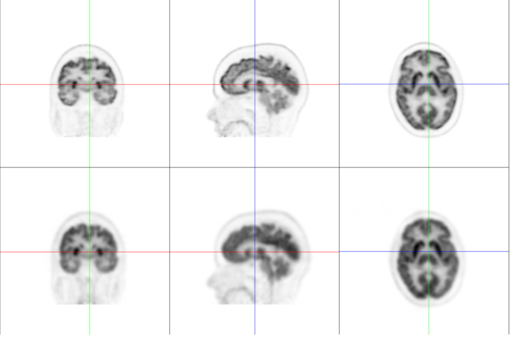 圖5:患者腦部PET圖像。上圖:PSF校正重建,下圖:AW-OSEM迭代重建。51歲女性,體重69.4 Kg,注射18F-FDG 10 mCi 后90分鐘行PET/CT腦部顯像。采用PSF校正技術(shù)后,腦部圖像分辨率、信噪比顯著提升。