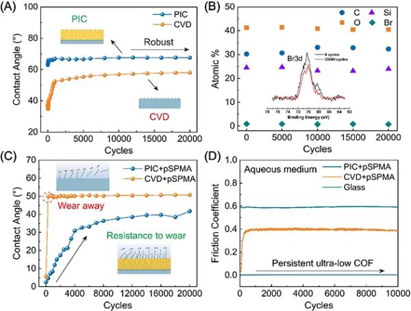 該方法的關鍵是構建了一種具有高機械穩定性、持續引發活性的引發劑涂層(Persistent Initiation Coating,PIC),如圖1所示,將引發劑引入到無機溶膠-凝膠納米涂層中,而后表面引發接枝修飾聚合物刷。與傳統的化學氣相沉積(CVD)方法制備的硅烷引發劑表面相比,PIC能有效提高引發劑層的力學穩定性,使其能夠承受上萬次的摩擦循環(圖2),最重要的是,在PIC上接枝的聚合物刷也比傳統CVD方法制備的聚合物刷具有更高的耐磨性。