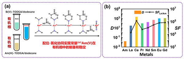 圖 (a)五價(jià)镅在有機(jī)溶劑中的制備和穩(wěn)定;(b)镅鑭廢液分離驗(yàn)證結(jié)果