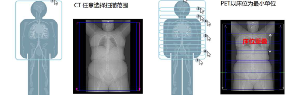 傳統PET/CT掃描中,PET與CT的一個區別就是掃描方式的不同。CT掃描可以根據患者的病變位置、診斷需求,精確設定掃描范圍。而PET步進式采集則需要以床位長度為最小單位調整掃描范圍,在臨床應用中不夠精確和靈活;此外,為了降低端面效應的影響,步進掃描必須設置一定范圍的床位重疊,以保障圖像質量和SUV值的準確性,但同時也降低了PET掃描的效率。