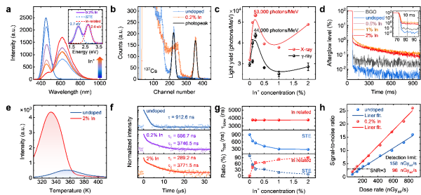 Cs3Cu2I5:In晶體閃爍性能:a、X射線激發發射光譜;b、137Cs 伽馬能譜;c、X射線和伽馬射線激發下光產額與In濃度的關系;d、X射線激發的余輝曲線;e、二維熱釋光譜;f、閃爍衰減曲線;g、閃爍衰減快慢分量、占比與In濃度之間的關系;h、不同X射線輻照劑量率下的響應信噪比
