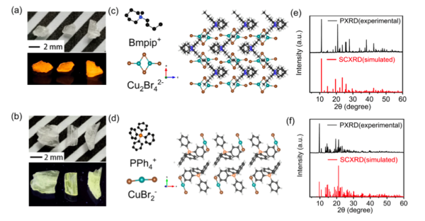 (Bmpip)2Cu2Br4和PPh4CuBr2晶體的物相性質:(a)(Bmpip)2Cu2Br4和(b)PPh4CuBr2晶體照片;(c)Bmpip+和Cu2Br42-基元,以及(Bmpip)2Cu2Br4晶體結構;(d)PPh4+和CuBr2-基元,以及PPh4CuBr2晶體結構;(e)(Bmpip)2Cu2Br4和(f)PPh4CuBr2粉末X射線衍射圖譜
