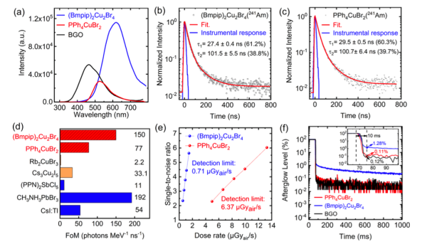 (Bmpip)2Cu2Br4和PPh4CuBr2晶體的X射線探測性能:(a)X射線激發發射譜;(b)(Bmpip)2Cu2Br4的閃爍衰減曲線;(c)PPh4CuBr2的閃爍衰減曲線;(d)與其他代表性閃爍晶體的品質因子對比;(e)不同X射線輻照劑量率下的響應信噪比;(f)X射線激發的余輝曲線