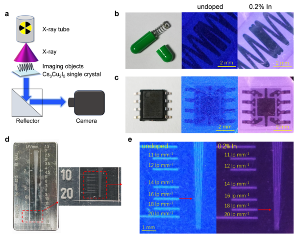 Cs3Cu2I5:In 晶體X射線成像性能:a、X射線成像系統原理示意圖;b-c、膠囊殼內的彈簧和電子元器件照片及使用未摻雜和In摻雜Cs3Cu2I5單晶作為閃爍屏的X射線成像圖;d、標準X射線成像測試板;e、標準測試板基于未摻雜和In摻雜Cs3Cu2I5單晶的X射線成像圖