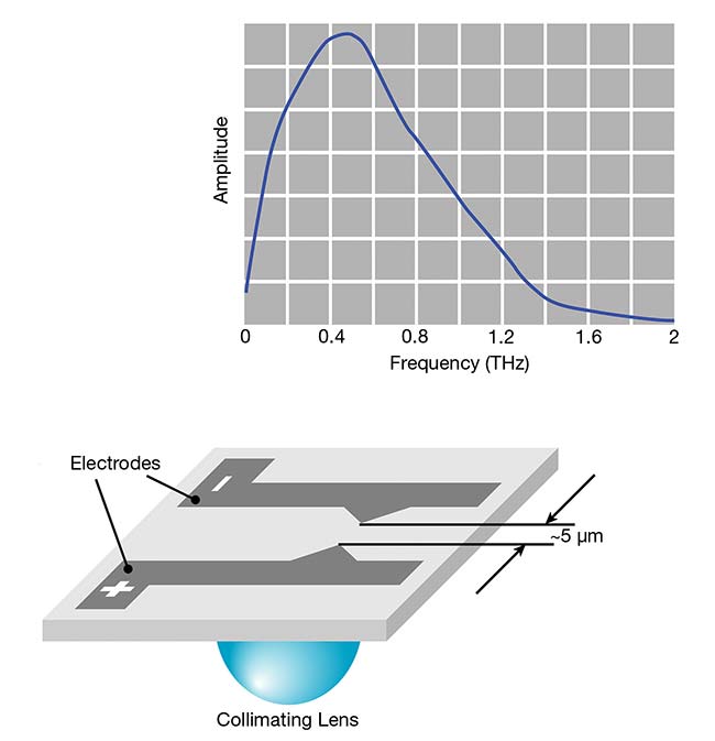 由超短激光脈沖和光電導開關產生的太赫茲輻射具有高強度和寬連續光譜的特點。由相干公司提供。
