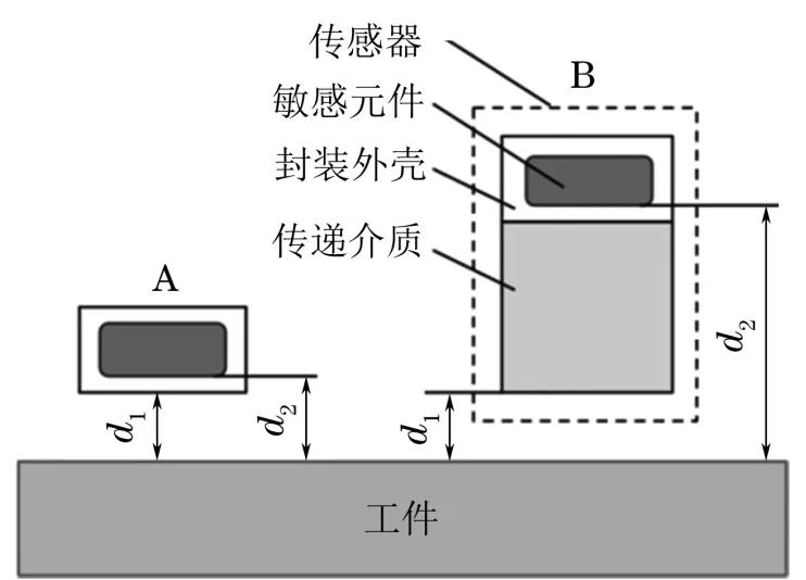漏磁檢測(cè)提離值定義如圖1所示。通常敏感元件和封裝外殼構(gòu)成的傳感器可以直接測(cè)量漏磁場(chǎng),如傳感器A,也可以在傳感器底部增加匯集磁場(chǎng)的傳遞介質(zhì)構(gòu)成靈敏度更高的傳感器,如傳感器B。如果考慮到傳感器耐磨、耐高溫、防止工件劃傷等目的,需要保持傳感器與工件之間有一定的提離值,即圖1中的d1,此時(shí)提離值定義中的“傳感器”應(yīng)該理解為具有獨(dú)立功能和封裝結(jié)構(gòu)的傳感器。但是,當(dāng)以“提離效應(yīng)”討論提離值時(shí),無論是貼片電感還是霍爾元件,傳感器外層的封裝結(jié)構(gòu)并不影響提離效應(yīng),實(shí)際的提離值仍為敏感元件與工件之間的距離,即圖1中的d2,而非傳感器底面與工件之間的距離d1,此時(shí)提離值定義中的“傳感器”應(yīng)該理解為敏感元件。下面介紹的諸多大提離檢測(cè)方法,也討論的是敏感元件到工件的距離。