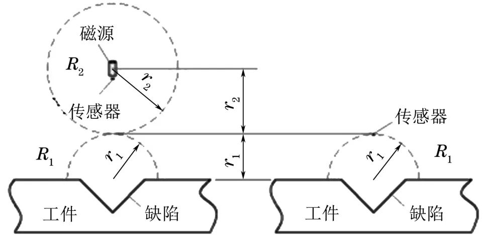 SUN的另一個(gè)研究提出了基于磁場(chǎng)擾動(dòng)的大提離檢測(cè)方法。磁場(chǎng)擾動(dòng)漏磁法與常規(guī)漏磁法對(duì)比如圖5所示,常規(guī)的漏磁檢測(cè)中只有一個(gè)缺陷漏磁場(chǎng)R1,漏磁場(chǎng)的擴(kuò)散半徑僅為r1。在磁場(chǎng)擾動(dòng)方法中,在傳感器上方增加一個(gè)附加磁源R2,磁源R2的磁場(chǎng)影響范圍為r2,磁源R2會(huì)與磁源R1相互作用,在r1和r2的范圍內(nèi)磁場(chǎng)產(chǎn)生相互擾動(dòng)。這樣通過兩個(gè)磁源的相互擾動(dòng)作用,就可以在磁源R2附近檢測(cè)到缺陷信號(hào)。顯然這樣布置的傳感器可以有很大的提離值,從而實(shí)現(xiàn)了基于磁場(chǎng)擾動(dòng)的大提離檢測(cè)。