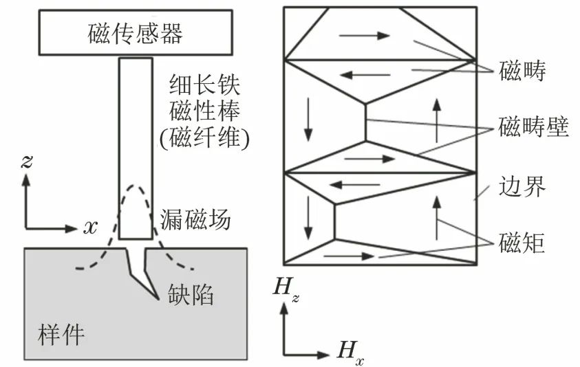 LEE等提出了一種通過磁導(dǎo)管傳遞漏磁場(chǎng)的大提離檢測(cè)方法,其原理如圖9所示。該方法在磁傳感器的下方放置磁導(dǎo)管(細(xì)長(zhǎng)桿狀的鐵芯),使漏磁場(chǎng)的磁感線通過磁導(dǎo)管傳遞至高處的磁傳感器。其整個(gè)磁場(chǎng)的傳遞過程基于磁疇的動(dòng)力學(xué)模型,外部的磁化會(huì)使磁導(dǎo)管內(nèi)部的磁疇重新分布,使磁疇變大,且方向與外部磁化場(chǎng)逐漸趨近。但是由于磁疇壁不能在位錯(cuò)、晶結(jié)或裂紋處移動(dòng),即使在x方向上施加漏磁場(chǎng),磁柱邊界處的磁疇壁也不會(huì)重新分布。而在z方向的磁化下,磁疇壁容易沿著z方向重新定位,從而使磁柱產(chǎn)生磁各向異性。因此細(xì)長(zhǎng)的磁導(dǎo)管就可以有效地將漏磁場(chǎng)傳遞至高處的磁傳感器,實(shí)現(xiàn)了大提離的檢測(cè)。