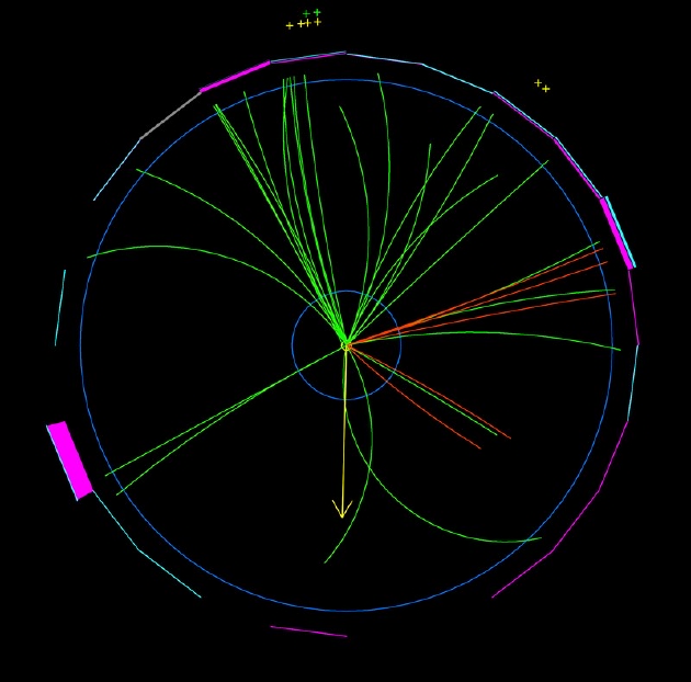 費米實驗室CDF探測器的粒子碰撞計算機圖像,顯示了一個W玻色子衰變成一個正電子(左下洋紅色塊)和一個看不見的中微子(黃色箭頭)。
