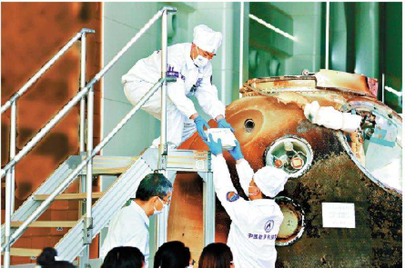 圖:4月26日,神十三飛船返回艙在京開艙,工作人員開艙取出包括作物種子在內的搭載物品。/網絡圖片