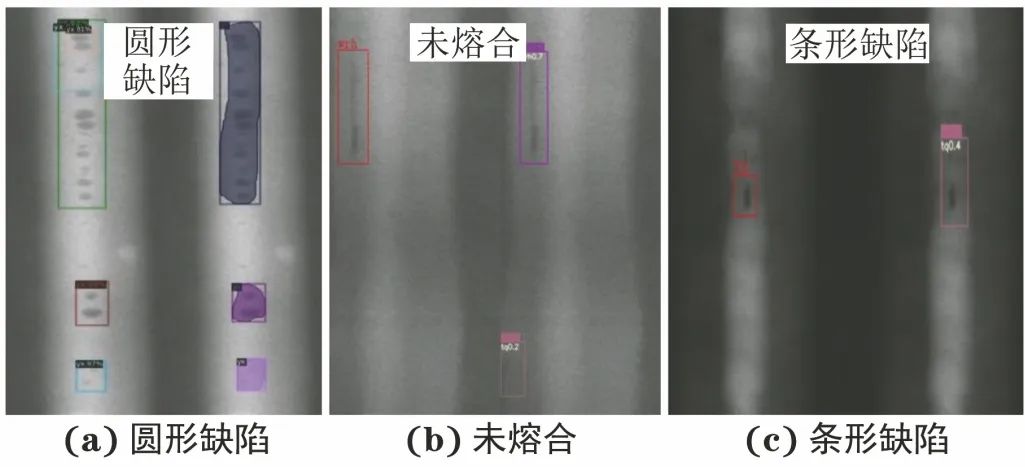 圖7 圓形、條形及未熔合缺陷圖像的人工標(biāo)注和智能識(shí)別效果對(duì)比示例