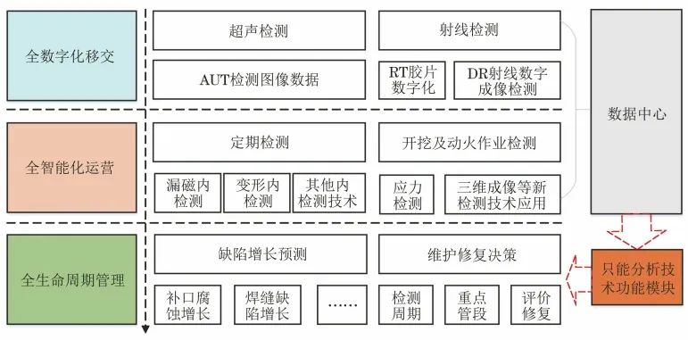 缺陷智能分析技術(shù)在管道環(huán)焊縫全生命周期中的作用如圖9所示,除建設(shè)期產(chǎn)生的射線、超聲等檢測(cè)圖像數(shù)據(jù)外,在役管道還需要進(jìn)行周期性的內(nèi)檢測(cè)及相應(yīng)的開挖檢測(cè),管道運(yùn)行階段仍會(huì)不斷產(chǎn)生新的管道環(huán)焊縫檢測(cè)數(shù)據(jù)。通過與建設(shè)期移交的無(wú)損檢測(cè)缺陷數(shù)據(jù)等進(jìn)行自動(dòng)對(duì)比,可以快速準(zhǔn)確地實(shí)現(xiàn)補(bǔ)口腐蝕和焊縫缺陷增長(zhǎng)的智能分析預(yù)測(cè),更好地做出維護(hù)修復(fù)決策。X射線檢測(cè)底片圖像的缺陷智能識(shí)別技術(shù),將在DR射線檢測(cè)圖像、AUT檢測(cè)三維圖像、內(nèi)檢測(cè)信號(hào)圖像等方面繼續(xù)發(fā)展,助力管道大數(shù)據(jù)價(jià)值的充分挖掘,實(shí)現(xiàn)管道智能化運(yùn)營(yíng)管理水平的提升。