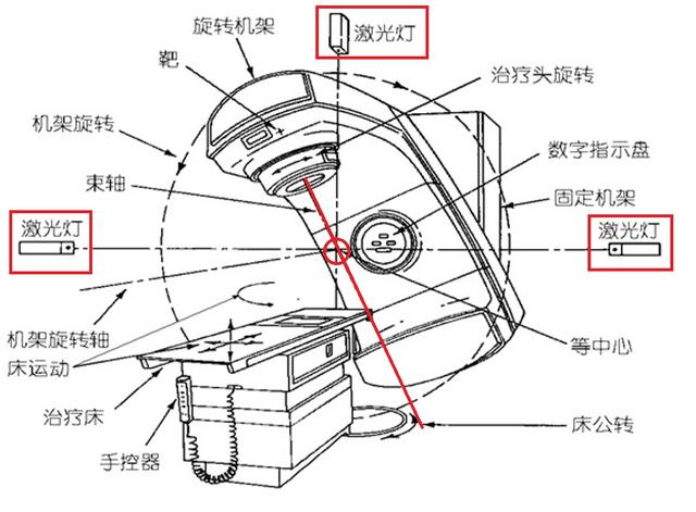 之所以叫等中心結構的加速器,是因為加速器在運動過程中,輻射束中心軸(上圖中紅色直線)始終通過上圖中紅色的小圓圈(直徑2mm)。