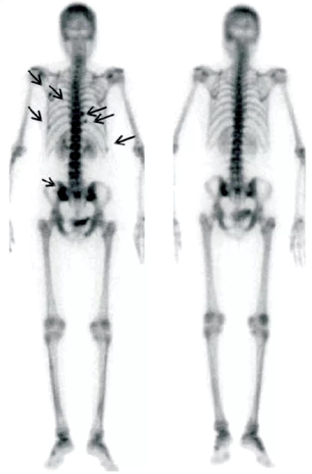 醫學成像:在醫學上,放射性同位素可用于診斷和治療(圖2)。應用最廣泛的是锝-99的一種同核異能素,每年達2000萬例。它只發射能量為 141 keV 的單一γ射線,沒有伴隨的β粒子,對成像非常理想。同時,它的半衰期為6小時,足夠掃描特定器官,并在短時間衰變,從而減小對患者的輻射劑量。作為所關注器官的親和分子的一部分,它被引入人體用作骨骼、大腦和心臟掃描的示蹤器。然而,它的快速衰變使它不能被存儲,這迫使醫院訂購其母核鉬-99。在核反應堆中,鉬-99通過鈾-235裂變產生,半衰期為66小時。鉬-99衰變產生锝-99,醫院通過化學方法,從鉬锝混合物中提取锝-99。