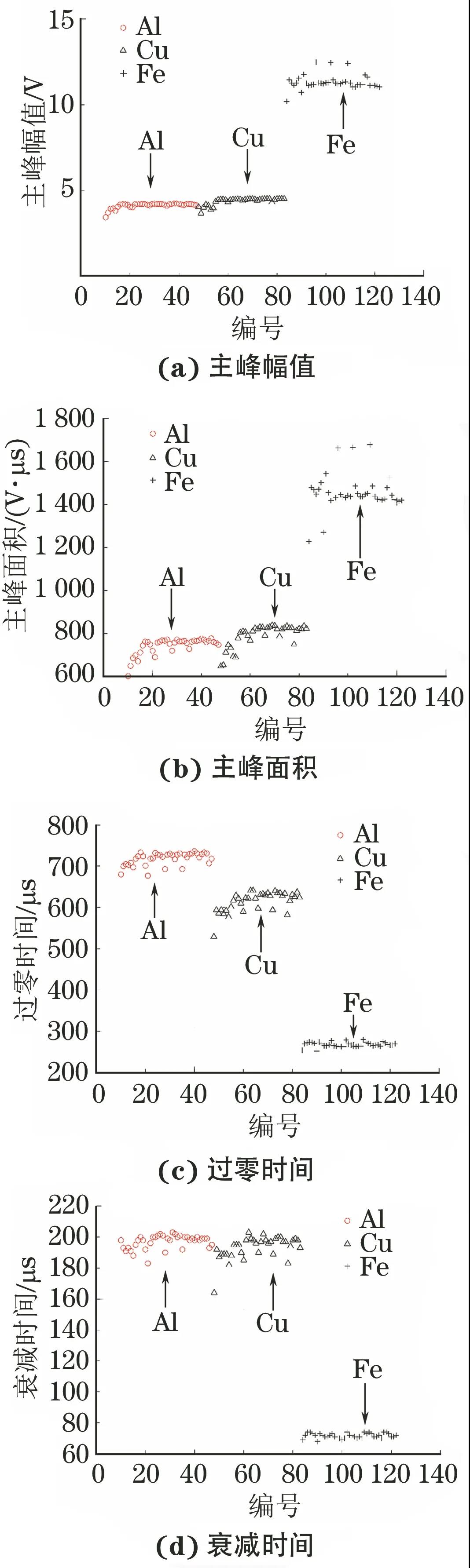 由圖4可知,由于鐵的磁導率遠大于銅和鋁,所以其脈沖渦流響應信號強烈,鐵試樣的主峰幅值明顯高于銅和鋁樣,主峰幅值可作為區分鐵磁性材料和非鐵磁性材料的直接特征。對每種試樣分別隨機采集50次響應信號,提取信號的峰值幅值、主峰面積、過零時間和衰減時間4個特征,分布規律如圖5所示,可見隨機采集數據的各個特征值波動較小,數據重復性較好。