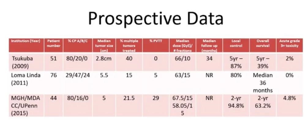 Molitoris教授分享了JCO雜志的一項單臂、II 期、多中心研究,納入來自麻省總醫院、MD安德森癌癥中心及賓夕法尼亞大學癌癥中心共92例腫瘤患者,經病理證實為肝細胞癌(HCC)或肝內膽管癌 (ICC),多學科會診確定腫瘤病灶不可切除,Child-Turcotte-Pugh 評分 (CTP) 為A或B,ECOG評分0~2,無肝外疾病,且既往未接受過放療。外周腫瘤患者(與肝門距離超2 cm)接受的放療總劑量為 67.5 GyE,15分次;中心腫瘤患者(距肝門2 cm內)總劑量為58.05 GyE,15分次。 在83例可評估的患者(44例HCC、37例ICC、2例混合HCC/ICC)中,中位隨訪時間為19.5個月,HCC和ICC的2年LC率分別為94.8%和94.1%。8例出現局部進展的患者其放療劑量均小于60 GyE。3例患者出現3級毒性反應(4%),表現為肝功能衰竭和腹水、胃潰瘍和膽紅素升高;無患者出現4~5級毒性反應。 Molitoris教授接著展示了其它三項前瞻性臨床研究結果,均表明質子治療的療效和安全性良好。