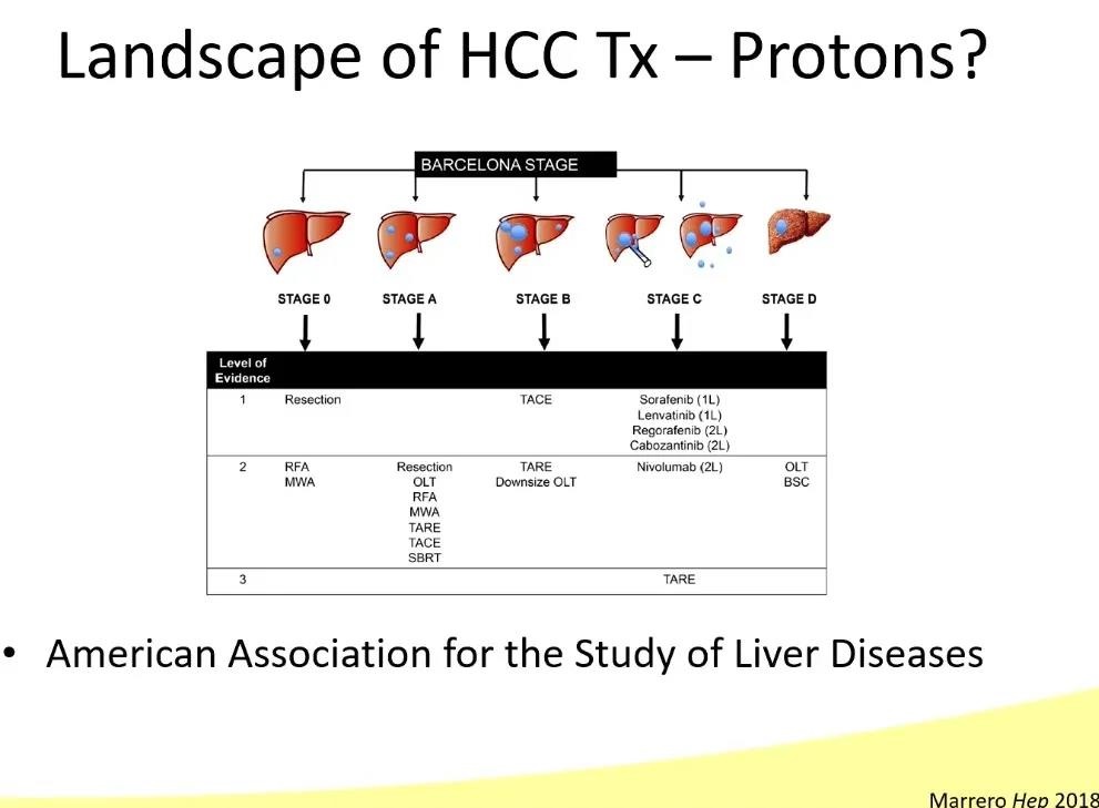 2018年歐洲肝病研究學會(EASL)推薦的HCC診療指南,未提及質子治療;美國肝病研究學會(AASLD)推薦的HCC診療指南中提到立體定向放射治療(SBRT)可用于Stage A的HCC。