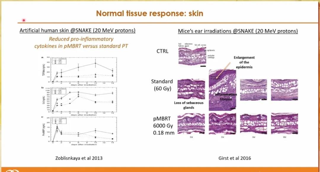 德國慕尼黑工業大學放射腫瘤系的研究人員在三維人體皮膚模型上進行的研究顯示,與標準質子治療相比,pMBRT可顯著減少炎癥反應和遺傳損傷,因此可提高對正常組織的保護作用。該團隊的另一項研究結果顯示,經標準質子治療照射后小鼠耳部組織出現皮脂腺消失、表皮肥大、炎癥、纖維化等損傷,而pMBRT組并未出現上述組織損傷。