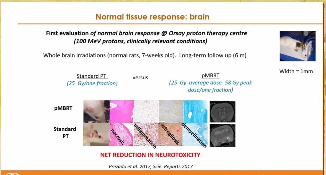 Dr.YolandaPrezado的團隊使用質子對大鼠進行全腦照射,隨訪6個月,結果發現,采用標準質子治療的大鼠出現皮膚毒性反應,腦組織出現壞死、炎癥、星形膠質細胞增生和脫髓鞘,而pMBRT組的大鼠并未出現上述反應。