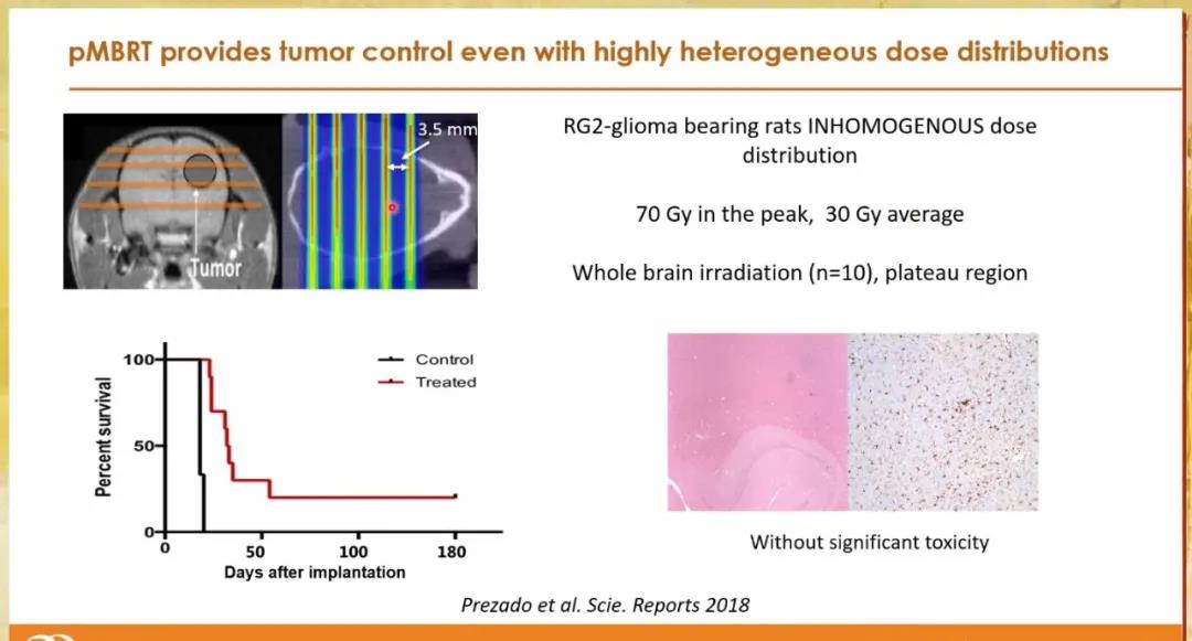 2018年,Dr.YolandaPrezado的團隊報告了pMBRT對膠質瘤大鼠腫瘤控制有效性的首次評估結果。研究顯示,pMBRT在22%的大鼠中實現了顯著的腫瘤控制和腫瘤根除。大鼠未出現實質性的腦損傷,這證實了pMBRT可擴大高級別神經膠質瘤的治療窗口,并可以用pMBRT對大腦進行大面積照射而沒有顯著的毒性。