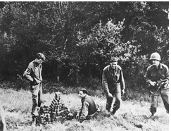 圖5.二戰期間B-VIII反應堆實驗的立方體被埋在地下實驗室附近的一塊田里。美國Alsos代表團的成員發現了它們,并將它們挖了出來。邁克爾-佩林(最左邊)、塞繆爾-古德斯米特(左三)和其他人展示了從地下取出這些方塊。照片由古德斯米特拍攝,由AIPEmilioSegrè視覺檔案館提供。